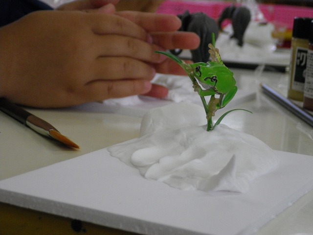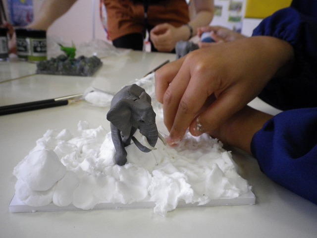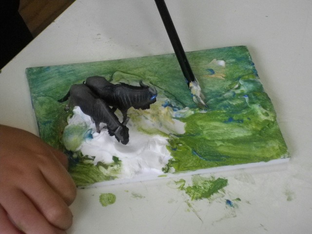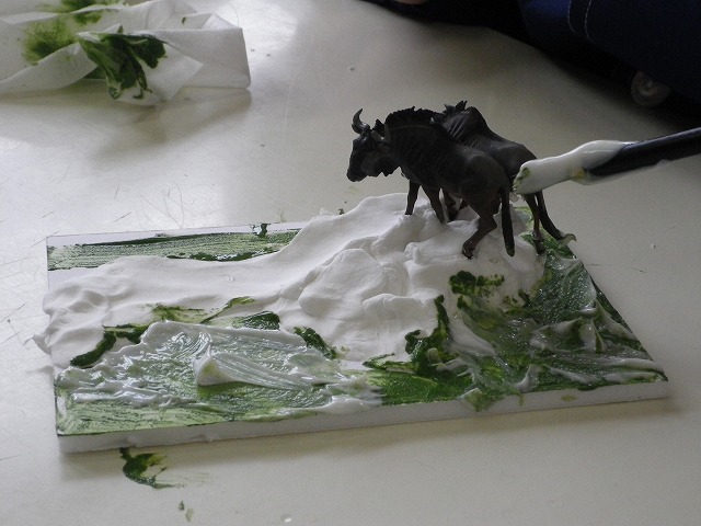 紙粘土とリアルな動物のフィギュアを使って土台をつくり、ペイントをしてオリジナルのジオラマを作りました。作成風景は下記ご覧ください。