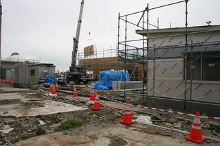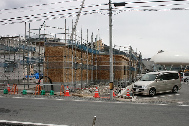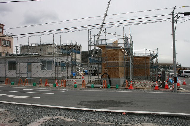 街中ににぎわいを呼ぶ「石巻まちなか復興マルシェ(仮称)」が見えてきました。仮設店舗4棟(うち1棟倉庫)の建設が佳境です。