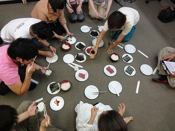 お茶っこ当日(1日)まえもって解凍しておいたマグロを、協議会スタッフ(本業料理人)に自身の包丁を持ち込んでもらいさばいていただき、さらに、酢飯、海苔、しょうゆ、わさび、も用意して手巻き寿司パーティとなりました。