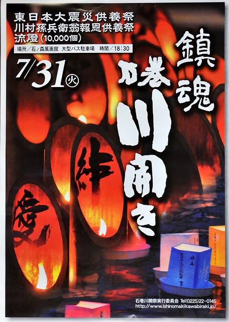 川開き祭りは、川の恵みに感謝するとともに、治水で石巻の街を救った川村孫兵衛重吉扇に対する報恩感謝の祭りとして始められ、供養祭などの祭典行事が厳粛 にとり行われます。