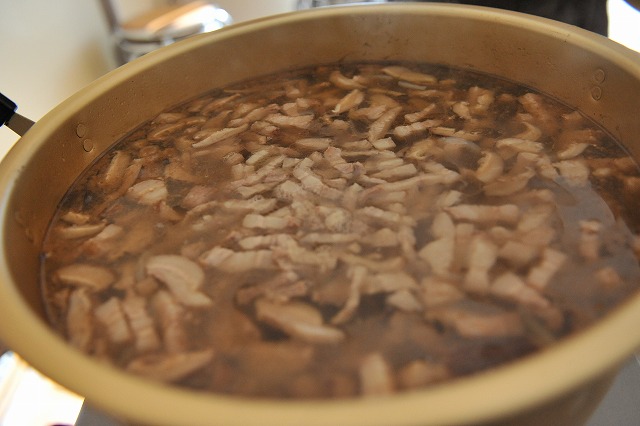 まずは「ジューシー」や「イナムドゥチ」で使う、豚の三枚肉を茹でました。大きなお肉の塊です!